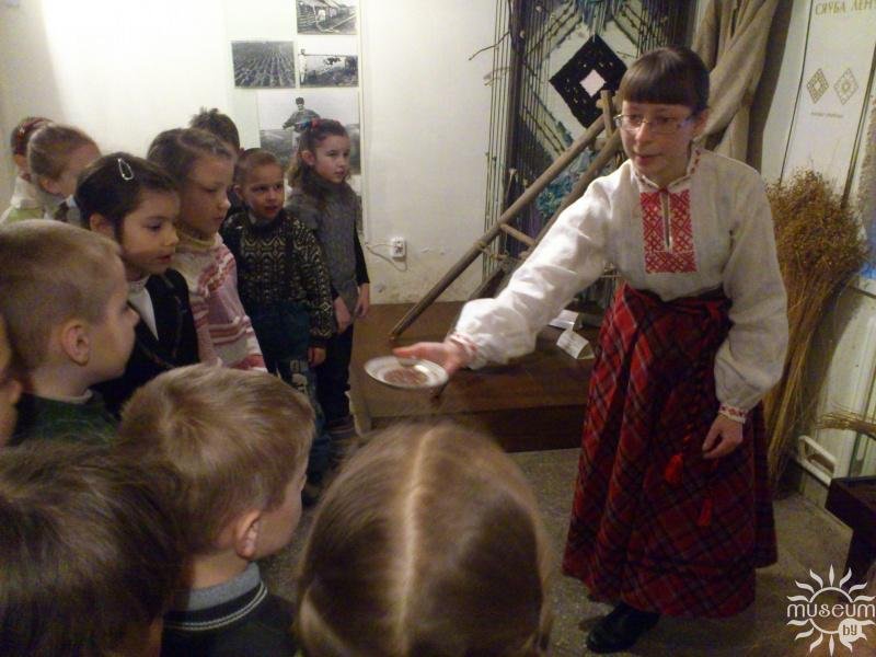 Падчас правядзення музейна-педагагічных заняткаў дзеці даведаліся як нараджаецца ільняная нітачка, і якая прыгожая тканіна атрымліваецца з іх. А гаспадыня музея Паўлінка расказала і паказала маленькім наведвальнікам, як апраналіся хлопчыкі і дзяўчынкі сто год таму.