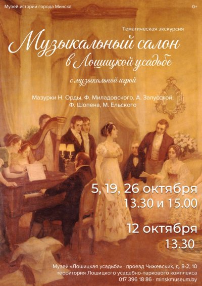 Музей «Лошицкая усадьба», филиал Музея истории города Минска, приглашает в усадебный дом на экскурсии с танцевальным мастер-классом «Один день из жизни Лошицы в XVI - XVII вв.», «Один день из жизни Лошицы в XVIII – середине XIX вв.», «Музыкальная жизнь Минска губернского и Лошицы в 1890-1910-е гг.» и «Лошицкая усадьба – жемчужина Минска губернского».